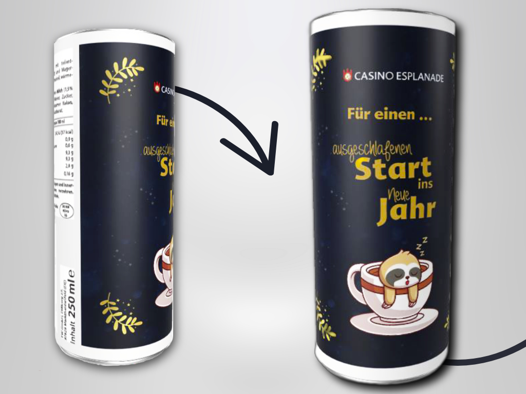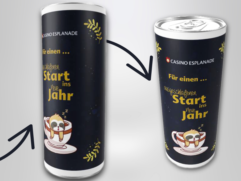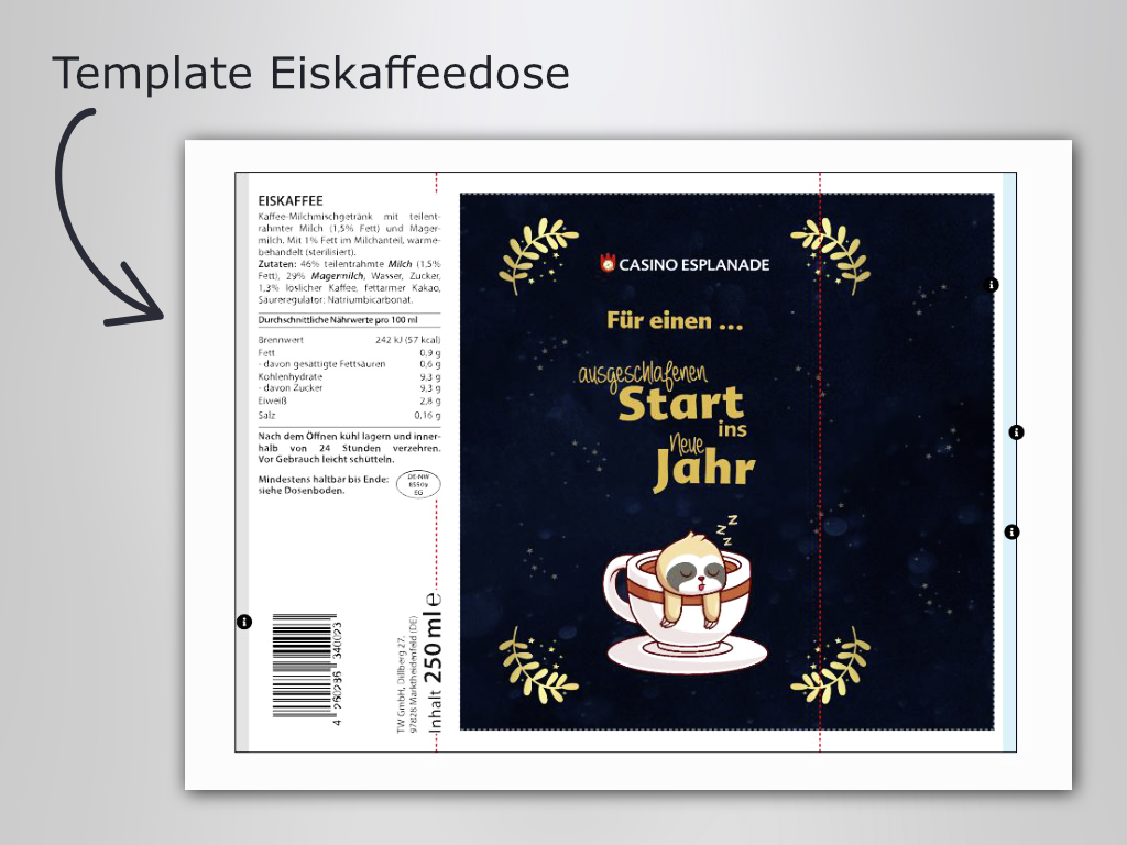 Als besonderes Gastgeschenk zur Silvesterparty 2022/2023 erhielten die Gäste eine liebevoll zusammengestellte Goodie Bag, in der unter anderem diese erfrischende Eiskaffeedose enthalten war.
